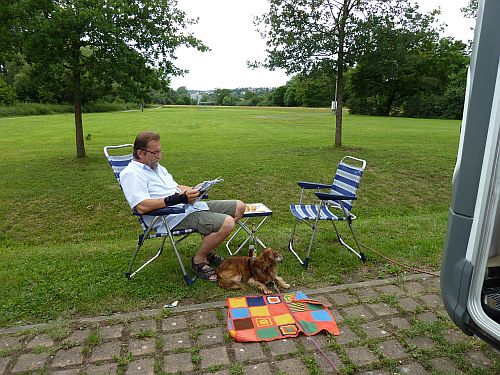 Bei einem Irish Coffee und meinem Eifelkrimi erhole ich mich im Sonnenschein, während Peter und Bruno schon nach wenigen Minuten an Ort und Stelle wegknacken und um die Wette schnarchen.