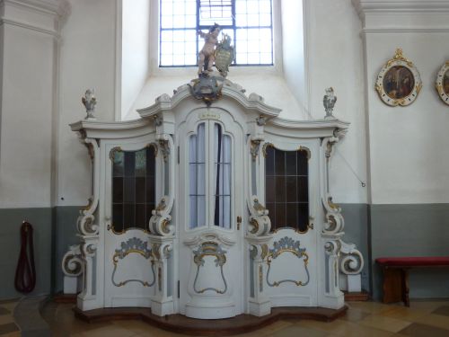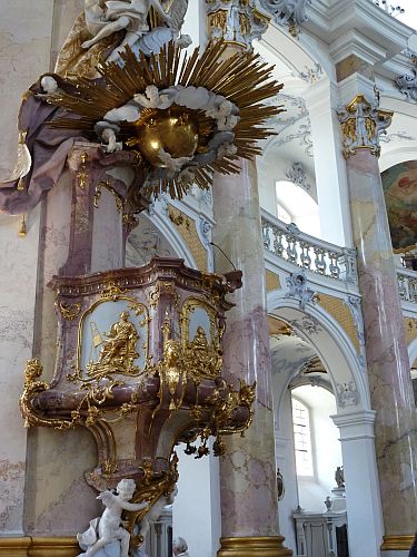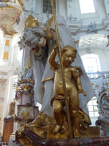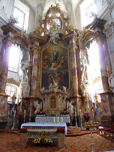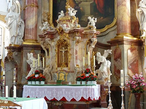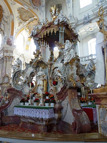 Der Gnadenaltar soll die Stelle zeigen, an dem ein Schäfer die Erscheinung der 14 Nothelfer hatte. Ursprünglich war er in der überkuppelten Vierung geplant, aber irgendwie haben sich die Baumeister vertan und nun steht er in Mitte des Langschiffes.
