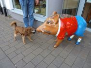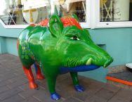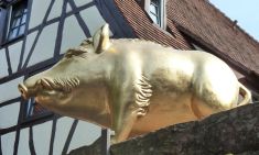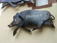 Schon gleich am Eingang zur Altstadt begegnen uns bunte Eber, die aufgrund einer Aktion des Lions- und des Rotary-Clubs von Künstlern bemalt und zugunsten der Eberbacher Jugend verkauft wurden bzw. immernoch werden.