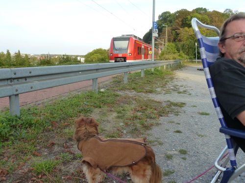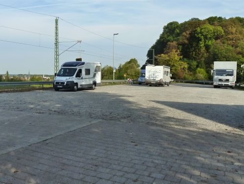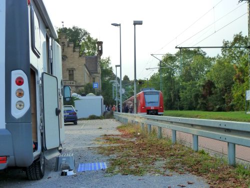 Wir fahren am Neckar entlang nach Bad Wimpfen und stehen hier nun auf dem Bahnhofsparkplatz zwischen den Geleisen und der Durchgangsstraße.