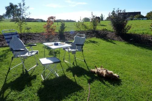Mähren neben dem Frühstückstisch. Und Bruno fühlt sich auch pudelwohl.