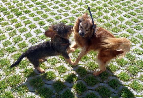 Bruno macht zwischendurch immer mal ein Tänzchen, wenn ein Hundi vorbeikommt, ansonsten hat er den Nachbarbulli zu seinem Zuhause erklärt.