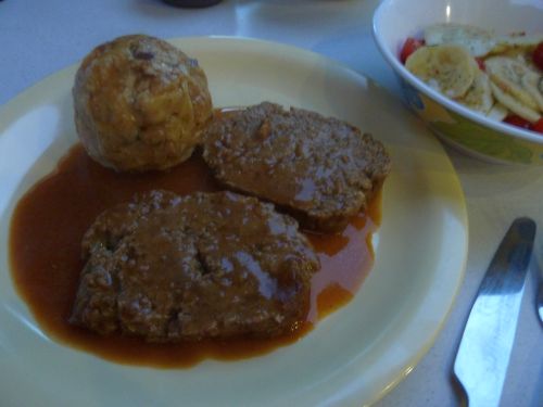 Heut gibts Hackbraten mit Semmelnknödeln und Tomaten-Gurkensalat und Flaschenbier.