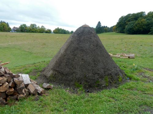 Kurz vor oben komme ich an diesen beiden Kohlenmeilern vorbei, die zum Schäfersfest am kommenden Wochenende gezündet und am Wochenende drauf geerntet werden. So werden 4 Raummeter Buchenholz zu Holzkohle.