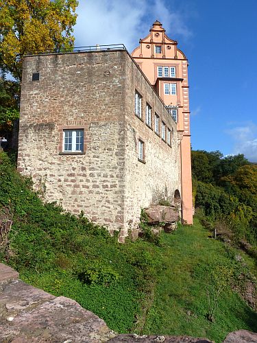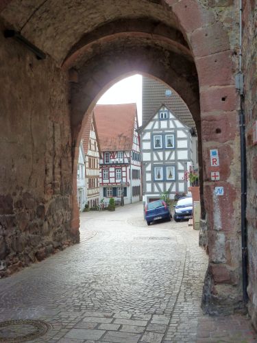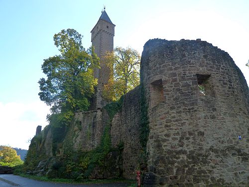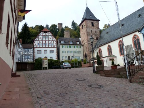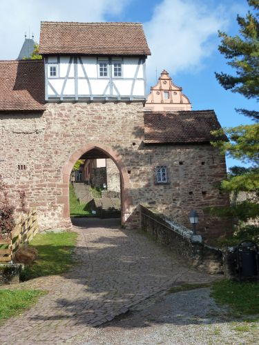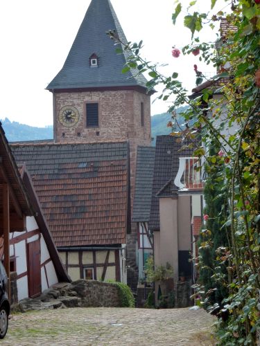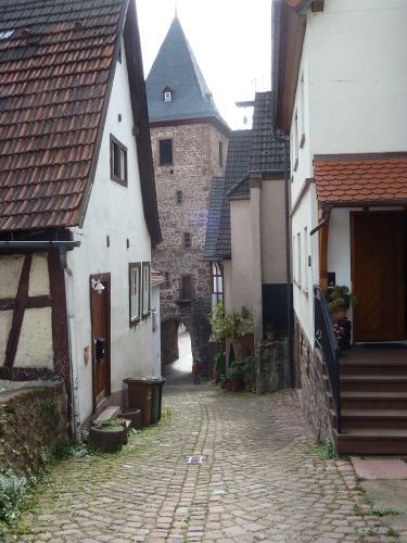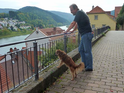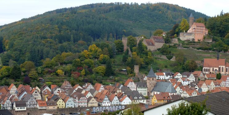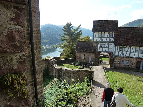Direkt am Ufer des Neckars liegt hinter einer dicken Mauer das Städtchen Hirschhorn.