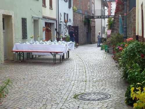Richtig idyllisch habens die Leute hier. Wenn Hof und Garten fehlen, macht man sichs mit Kind und Kegel auf der Straße gemütlich.