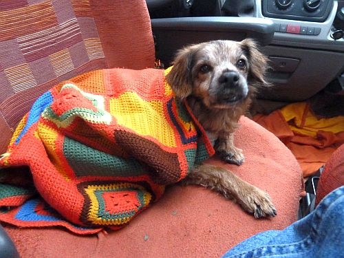 und suchen dann den nächsten Taxistand, denn unser Butzel zittert sich einen ab. Er hat aber prima durchgehalten, denn wir waren fast 2 Stunden im Regen unterwegs.