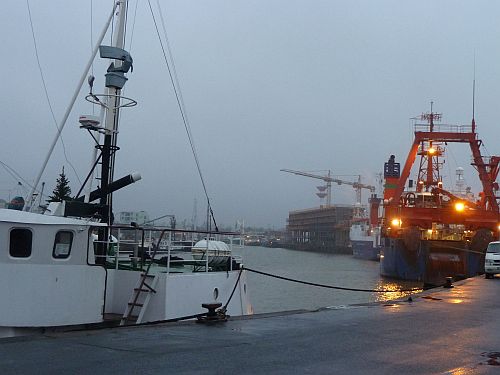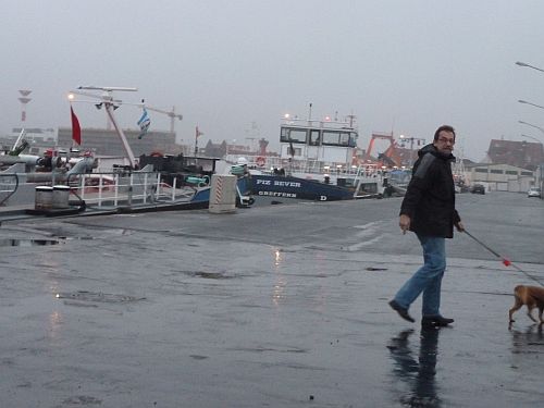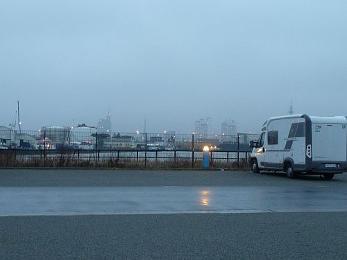 Nach dem Frühstück packen wir, bekommen vom Platzbetreiber ein Weihnachtstütchen mit auf den Weg, und brechen auf Richtung Bremerhaven. Der Stellplatz an der Doppelschleuse ist gut besucht, aber irgendwie steht man in einem Loch und kann kein Wasser sehen. Also probieren wirs am Fischkai, auch wenn er vermutlich geschlossen hat. Und als wir ankommen hängt tatsächlich eine Kette davor und der Platz ist leer. Gleichzeitig mit uns kommen die Nachbarn, die beim Kuhhirten neben Wolfherm standen, ebenfalls hier an. Und wir beratschlagen, was zu tun ist. Dabei stellt sich heraus, dass das Vorhängeschloss nur eingehängt ist, und wir können doch auf den Platz. Der Automat hat aber schon Feiertag, denn er schluckt zwar das Geld, spuckt aber kein Ticket aus. Egal, wir haben ja Zeugen, dass wir bezahlt haben.