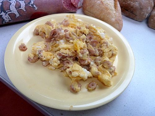 Es gibt erst mal lecker Rührei mit Büsumer Krabben, und hinterher paar Scheiben Bremer Knüppel aus dem Sack.