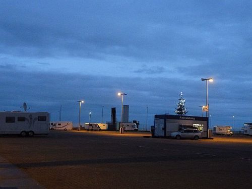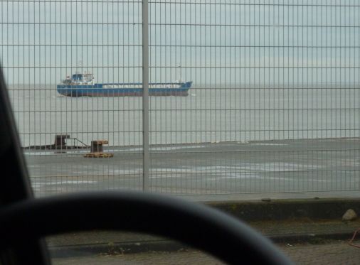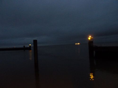 Bilder vom Platz gibts also erst morgen. Wir stehen direkt hinterm Deich, und endlich kann Bruno nach Herzenslust pinkeln, als ich auf dem Deich nochmal nach den Schiffen gucke, die hell erleuchtet hier vorbeiziehen.
