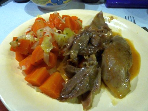Egal, wir sitzen trocken, und außerdem ists Zeit fürs Abendessen. Es gibt Pute mit Kartoffelsalat, Gurkensalat und Möhren.