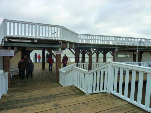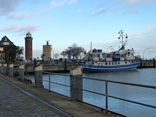 Rechts von uns schauen wir auf den Leuchtturm an der Alten Liebe. Und zur Begrüßung kommt sogar die Sonne kurz heraus, was wollen wir mehr.