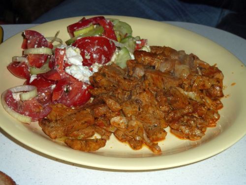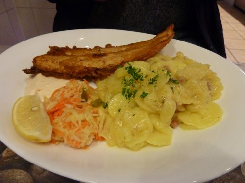 Peter hat dazu lauwarmen Speckkartoffelsalat und ich süßsauren Krautsalat. Die Portionen sind riesig, auch wenns hier nicht so aussieht, weil die Teller übergroß sind.