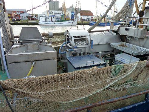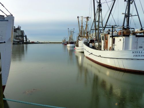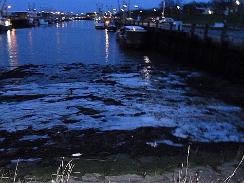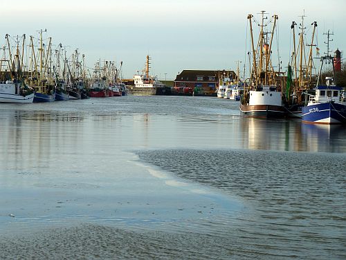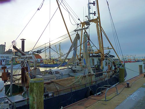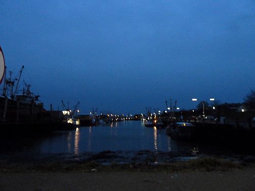 Kurz vor Einbruch der Dunkelheit - so gegen 16:00 - mach ich mich mit Bruno nochmal auf den Weg, denn jetzt ist Niedrigwasser und im Hafenbecken müssten nun die Krabbenkutter unten sein.