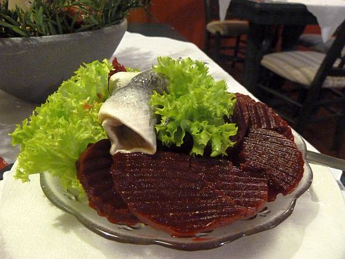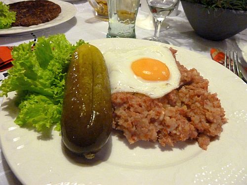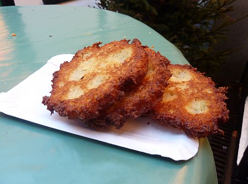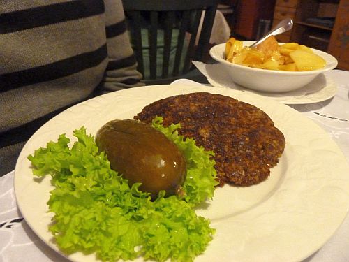 Der Fladen nennt sich Knipp und ist eine gut gewürzte kross gebratene Grützwurstmasse. Dazu gibts Bratkartoffeln.
