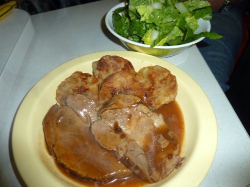 Schweinsbraten und gebackene Semmelnknödeln, die ich zuhause noch schnell vorgeknödelt habe. Schmegge musses.