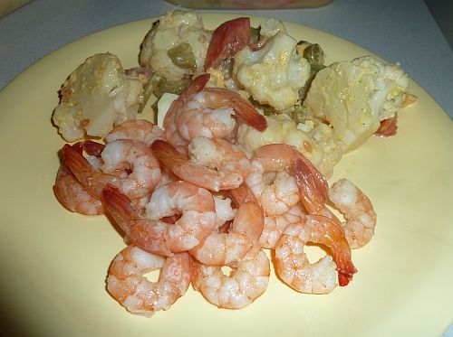Da der Nierenspieß ausgefallen ist, gibts Knoblauchgarnelen. Peter tunkt Baguette, und bei mir gibts nen Rest Blumenkohlsalat dazu. Ja, das passt zusammen, auch wenn ichs nicht gedacht hätte.
