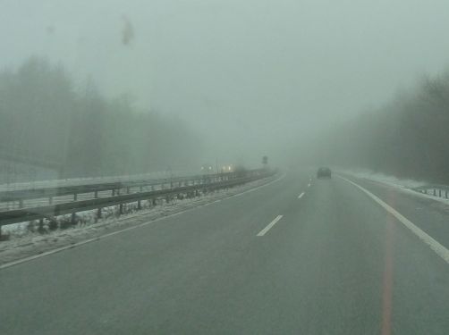 Es geht am Rand des Rothaargebirges durchs Siegerland, mit Schnee und Nebel,