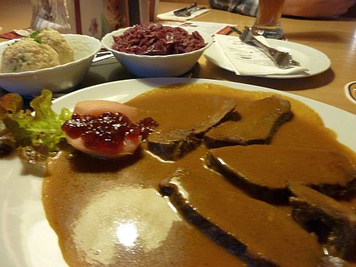 Mein Wildschweinteller war genauso groß, also die Portion war riesig, und ich hab nur einen Knödel gepackt. Und auch vom Rotkraut hat mir ein Löffel voll gereicht. Es war richtig lecker und jetzt sind wir pappsatt.