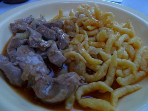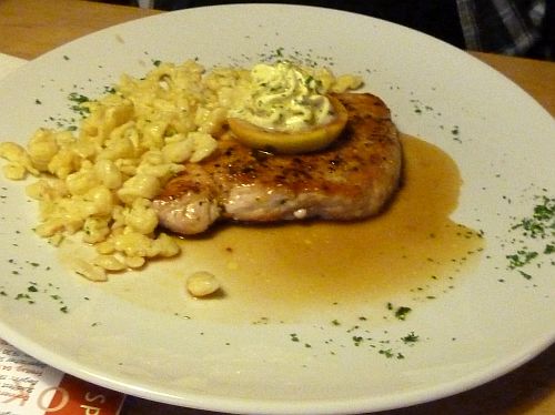 Peters Pfeffersteak sieht zwar bissi mickrig aus, aber das liegt am großen Teller. Außerdem gabs noch mehr Spätzle und nen Salat.