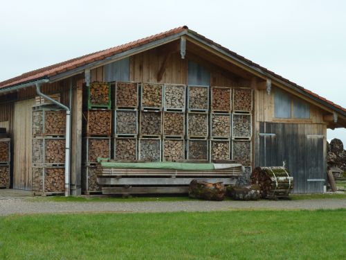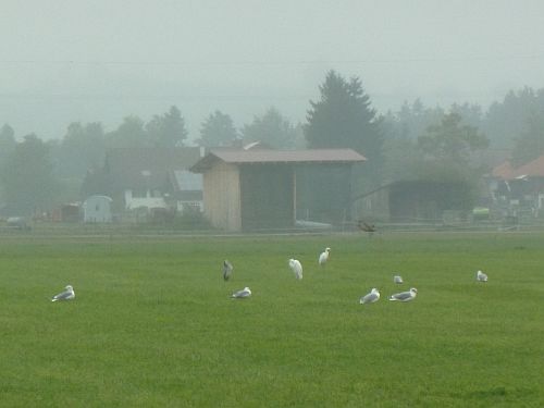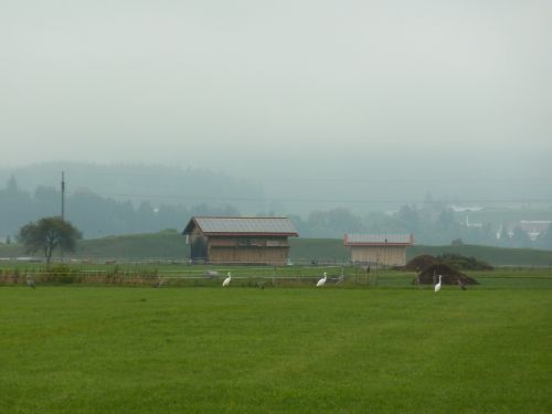 Auf den Wiesen stehen Silberreiher, und das Holzlager hier sieht aus wie ein großes Insektenhotel. Also zu sehen gibts trotz Nebel einiges.