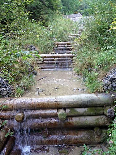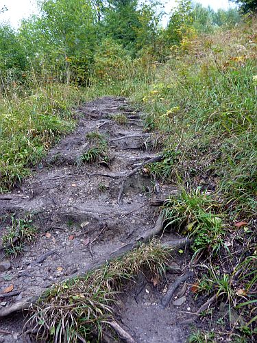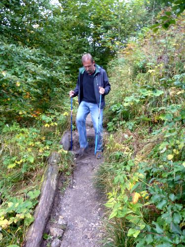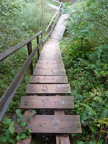 Dumm ist, dass der Weg für Riesen gemacht ist. Während die Holzstufen normale Höhe haben, sind die im Berg befestigten Tritte ca. 50 cm hoch, auch die ausgetretenen Stufen zwischen den Wurzeln, und ich Zwerg hab da meine liebe Mühe runter zu kommen. Bilder gibts aber nur vom gemäßigten Teil der Strecke, denn ansonsten war ich zu beschäftigt und angespannt, und mein Fotoapparat sicher verstaut in der gepolsterten Jackentasche.