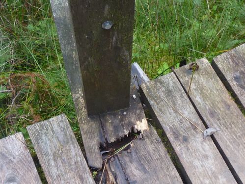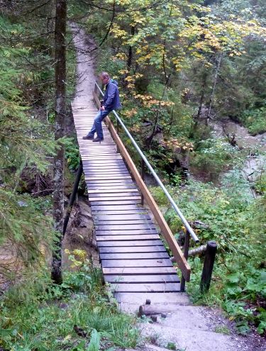 Immer wieder führen Stege über die Gumpen, und Peter muss mal kurz den Helden raushängen lassen, als er auf mich wartet. Wie tief es runter geht, sieht man leider nicht auf dem Bild. Und sowieso sieht jetzt hier alles ganz harmlos aus.