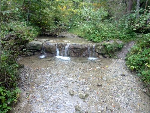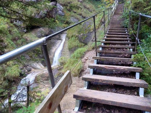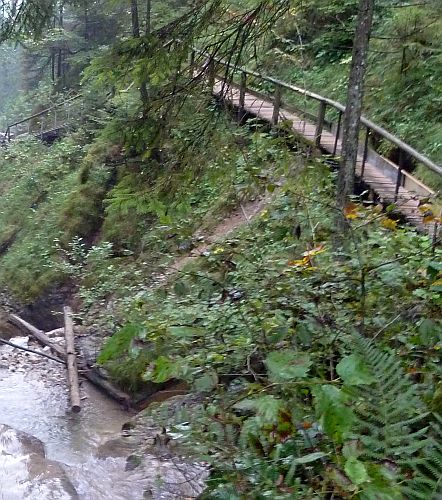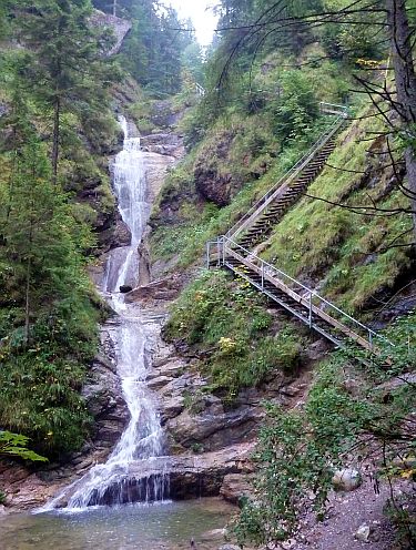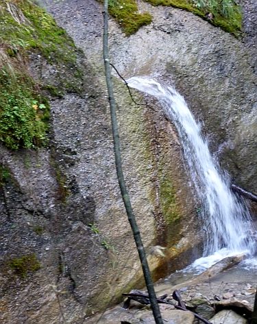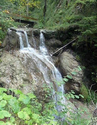 Wir könnten jetzt den normalen Mittelweg nach unten nehmen, aber wenn wir schon mal ohne Hund unterwegs sind, wollen wirs wissen und nehmen den Wasserfallweg, der eigentlich ein Steg oder Steig ist. Bissi riskant ists schon bei der Matsche, aber wir haben Stöcke mit und wagen es.