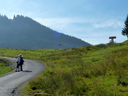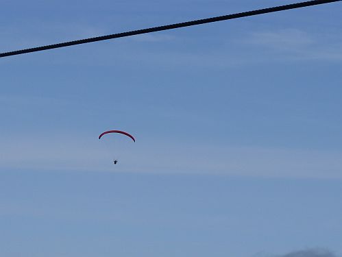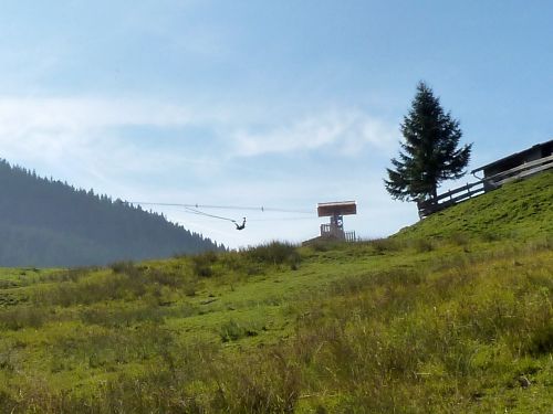 Wir machen uns nach einer kurzen Pause an diesem Adrenalinseil auf den Weg. In der Bildmitte sieht man den Schreihals ankommen, bevor er dann kurz vor dem Ziel abrupt ausgebremst wird. Für solche Späßchen sind wir gottseidank zu alt.
