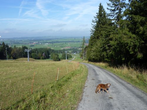 Inzwischen kämpft sich die Sonne langsam durch den Nebel und wir machen uns fertig für die Alpspitzbahn. Heute darf Bruno mit und wir wollen ganz langsam den Mittelweg runterspazieren, denn das dauert nur schlappe 40 Minuten. Fürs Wägelchen ists aber zu steil. Der Butzel muss laufen.