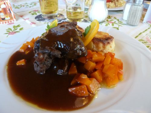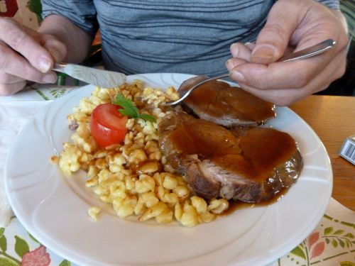 Für Peter gibts einen Schweinsbraten mit Knöpfle, und ich hab Hasenkeule mit Kürbisgemüse und Kartoffelgratin.