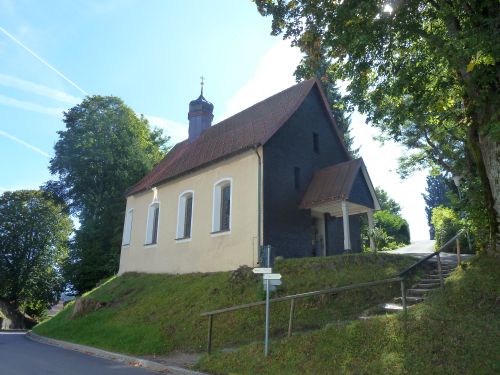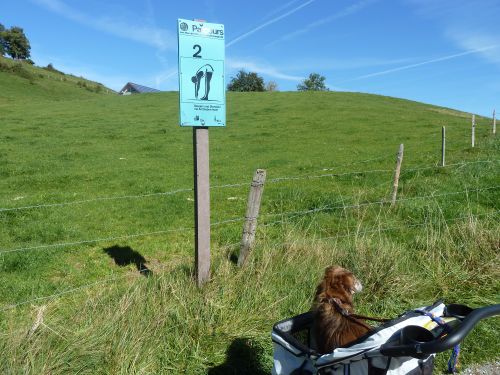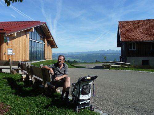 Und wieder gibts erst mal einen Imbiß, denn ich hab unterwegs ganz leckeres Früchtebrot gekauft. Und dann packen wir unsren Rüpel wieder ins Wägelchen und erklimmen den Kreuzberg, also den Hügel, der hinter Peter zu sehen ist. Von hier aus sieht er ganz flach aus, aber er hat es in sich. Der Rundweg hat nur 3 km, aber die Höhenmeter habens in sich,