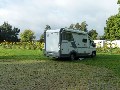 Auf dem Rückweg holen wir noch Brötchen, und jetzt kann ich auch das Stellplatzbild nachliefern.