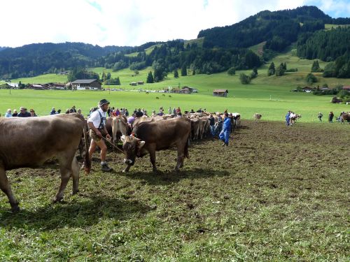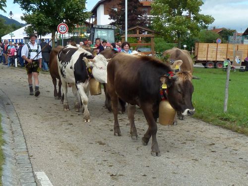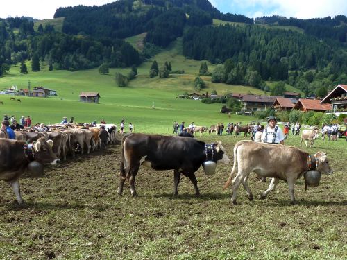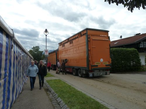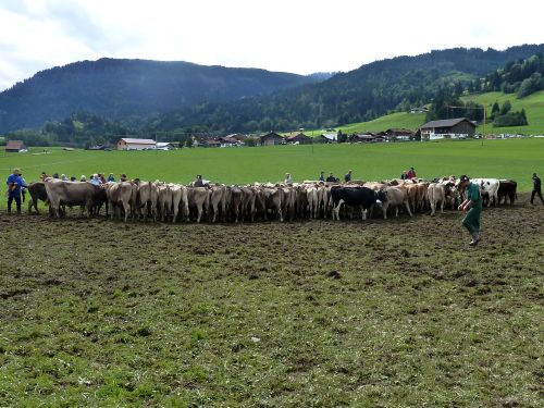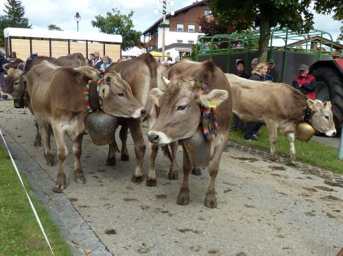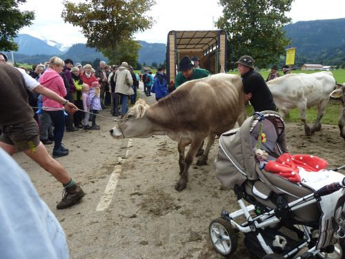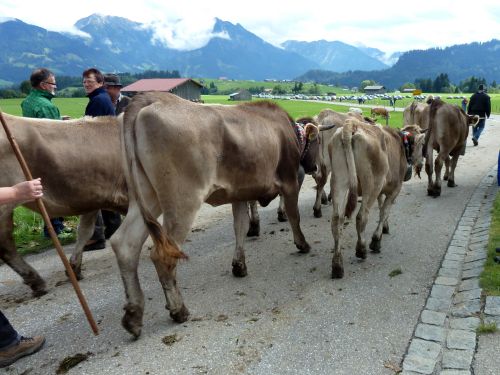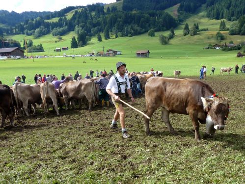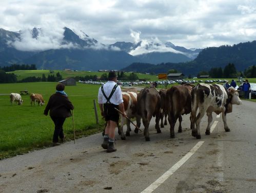 Weiter gehts durch Friede-Freude-Eierkuchenlandschaft direkt nach Bolsterlang, das liegt kurz hinter Obermaiselstein, und dort ist heute Viehscheid. Er hat zwar schon um 10:00 angefangen, aber so schnell sind die ja damit nicht durch. Die bekränzten Tiere sehen wir zwar nicht mehr, macht nix, das kennen wir schon. Vielleicht sehen wirs übermorgen in Obermaiselstein.