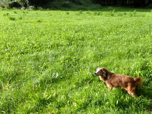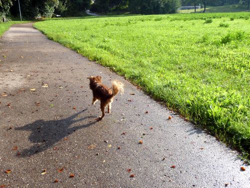 Der kleine Rüpel kann sein Glück garnicht fassen. Sonne und Gassi mitohne Regenmantel und Leine.