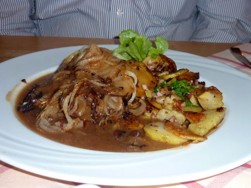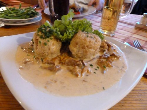Ich hatte Semmelnknödeln mit Pfifferlingrahmsoße. Richtig lecker. Die Pfifferlinge waren zwar nicht so üppig in der Soße verteilt, aber es hat gepasst. Doch dann wurde mir klar, warum da so ein großes Salatblatt hinter den Knödeln lag, denn Salat gabs ja extra. Ich legte also irgendwann die Deko zur Seite und fand darunter einen dicken Batzen Pfifferlinge, die sich versteckt hatten. Es hat ihnen nichts genützt, ich hab sie alle verputzt.