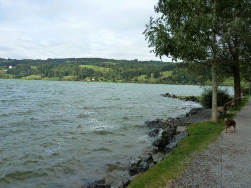 In Obermaiselstein der Stellplatz ist heute leider noch voller als gestern. Er ist so vollgestopft, dass niemand mehr rausfahren kann. Einfach irre. Also fahren wir weiter nach Immenstadt, doch dort ist der Stellplatz, der jetzt der Viehscheidplatz ist, gesperrt. Weiter gehts zum Alpsee, und dort machen wir einen schönen Spaziergang am See entlang, bis hinter zum Freibad.