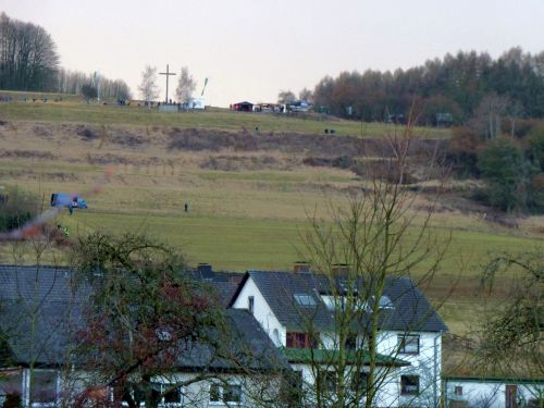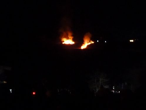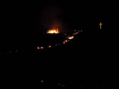 Dann spielt die Blaskapelle, man sieht Gewusel am Berg, jede Menge Aktive scheinen sich dort oben rumzutreiben, und dann kommt der erste Donnerschlag, die Beleuchtung des Kreuzes geht aus, daneben flackert das erste Rad auf, und dann kommts runter.