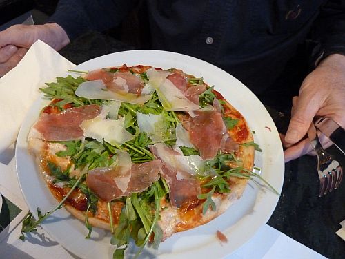 Wiebke und ich hatten lecker Lammfilet, Peter Schweinerückensteak, und Konrad eine Pizza mit Rucola und Zitronenöl.