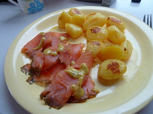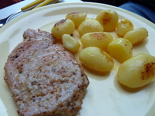 Zum Abendessen gibts Bratkartoffeln mit Steak und Lachs.