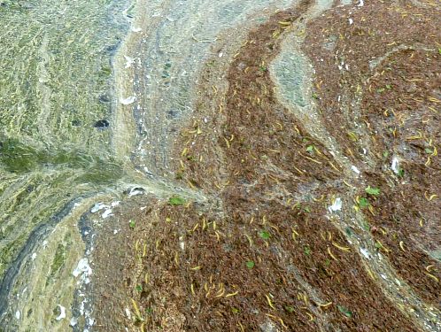 Wind und Wetter haben aus Blütenstaub und Federn bunte Bilder auf den Teich gemalt,