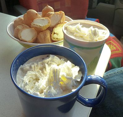 Dass dies garnicht der Stellplatz ist, sondern Teil des Campingplatzes, sehen wir erst später. Aber egal, wir ziehen nicht mehr um und trinken erst mal einen leckeren Irish Coffee. Dazu gibts halbgefrorene Windbeutelchen, denn ich hab unsre Vorräte vorhin bei Lidl noch mal richtig aufgefüllt.