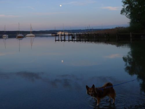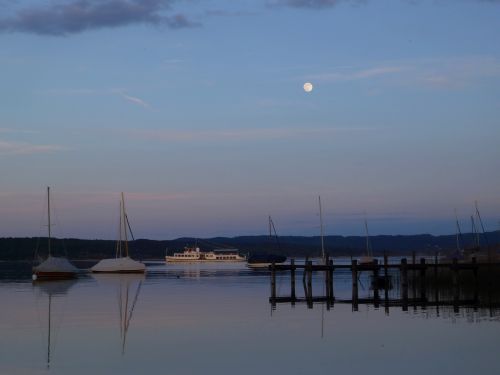 Beim Abendgassi ists noch so warm, dass wir ohne Jacke gehen können. Der See liegt ganz ruhig da, draußen fährt der Dampfer gerade unterm Mond durch....