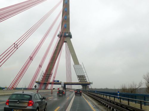 Diesmal ists auch nicht viel heller als vorgestern, als wir über diese Brücke fuhren. Allerdings wars vorgestern schon nach 16:00, also fast Nacht.