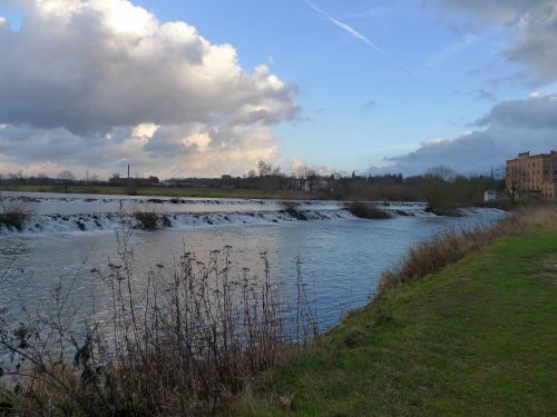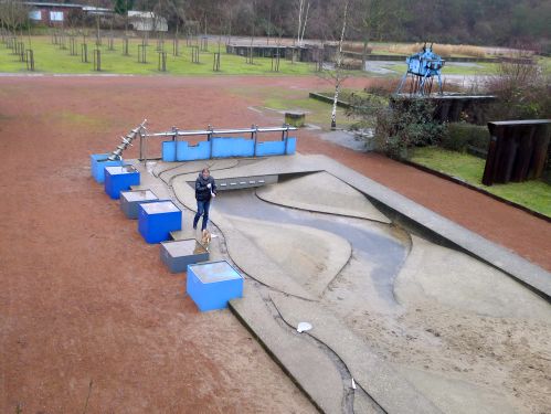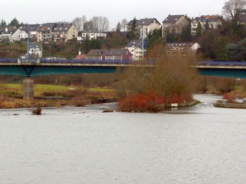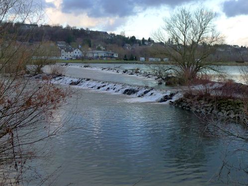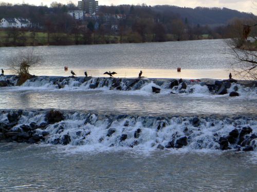 Und weiter vorn fließt die Ruhr rechtwinklig um die Ecke. Und weil das bei einem Fluss eigentlich garnicht geht, stürzt sie sich einfach mit Getöse zweimal nen Meter in die Tiefe und fließt danach einfach rechtsrum weiter. Jetzt ist aber grad doofes Wetter, um dies näher zu ergründen. Später gehen wir nochmal hierher.
