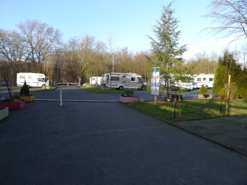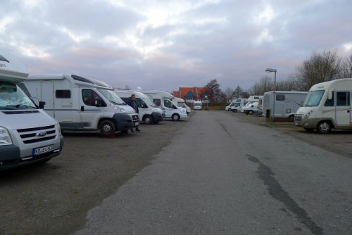 Wir finden auch den Parkplatz. Aber da haben sie eine Höhenbegrenzungsstange hingemacht, sie wollen uns nicht. Also fahren wir durch das riesige Gelände zum nächsten Parkplatz, aber da steht sogar ein extra Schild, auch hier wollen sie keine Womos und Busse.