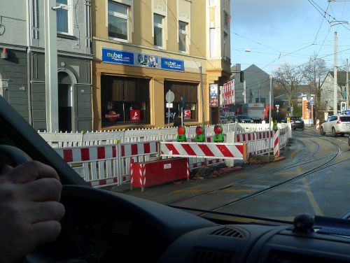 einer Straßenbaustelle und Peter begegnet einer Straßenbahn zwischen zwei