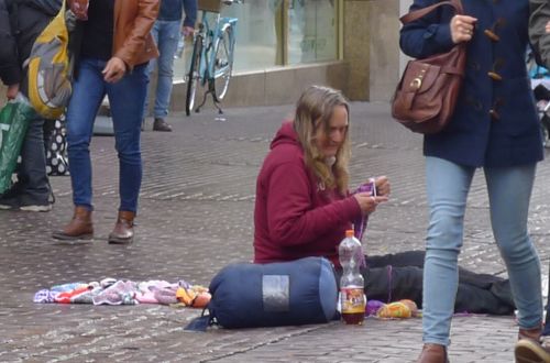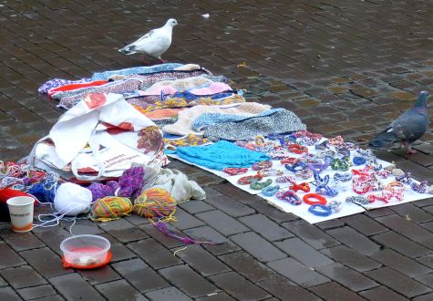 Und die Bettler scheinen eine neue Masche zu haben. Sie sitzen da und sticken und stricken, also verkaufen unsinnige gestrickte Lappen und Armbänder, die nix darstellen. Also nur pro forma.