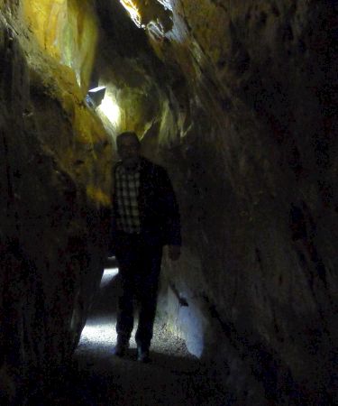 Jedenfalls ist sie wirklich richtig eng und Peter muss ständig auf seinen Kopf achten. Ich hab Probleme in der Dunkelheit stabil zu stehen, denn dieses Stop and Go und der unebene Untergrund ist für die Knie verdammt anstrengend. Bei 98% Luftfeuchtigkeit fällts Atmen auch langsam immer schwerer, aber fürs Asthma solls gesund sein. Vielleicht wars aber auch ein wenig die Angst, die so langsam in mir hochkrabbelte, denn 500 m sind ganz schön lang, und der Ausgang sitzt leider nicht am Ende, sondern wir müssen die ganze Strecke wieder retour.