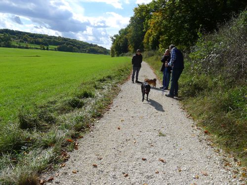 Wie auf dem echten Jakobsweg gibts auch Begegnungen, Carl hat aber wenig Interesse an anderen Hunden, seine Mäuschen warten auf der Wiese, da muss er gleich wieder hin.